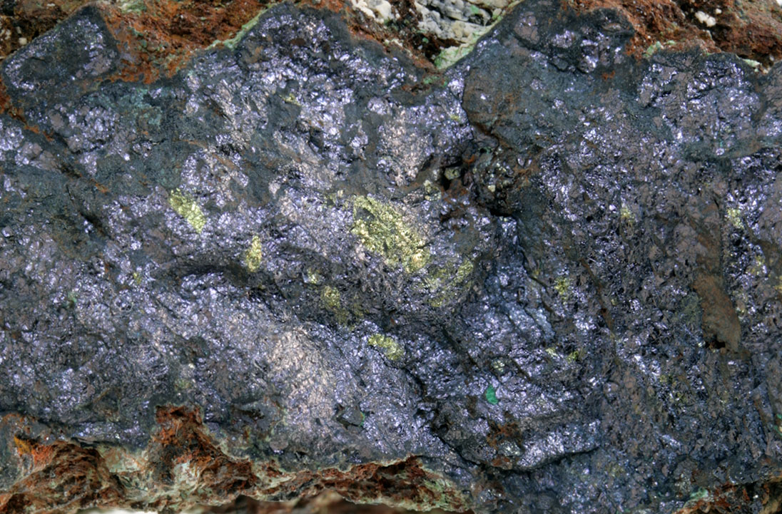Color: Rojizo metálico brillante en superficies frescas; se torna pardo oscuro o verdoso al alterarse (pátina de óxidos y carbonatos de cobre, como malaquita y azurita).