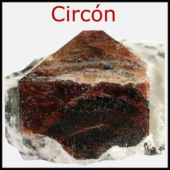 En gemas incoloras, puede simular diamante, pero el circón es más blando (7.5 vs 10) y muestra doble refracción; no confundir con zirconia cúbica (sintética, isotrópica).Imagen: Cristal prismático de circón pardo en matriz granítica (Península de Kola, Rusia).