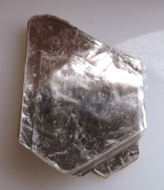 ~25% más denso que cuarzo (~2,65); útil para distinguirlos.Clivaje: Exfoliación perfecta basal {001}. Se parte fácilmente en láminas paralelas a la base; propiedad diagnóstica (cuarzo no tiene clivaje). Requiere cuidado al tallar/engastar.